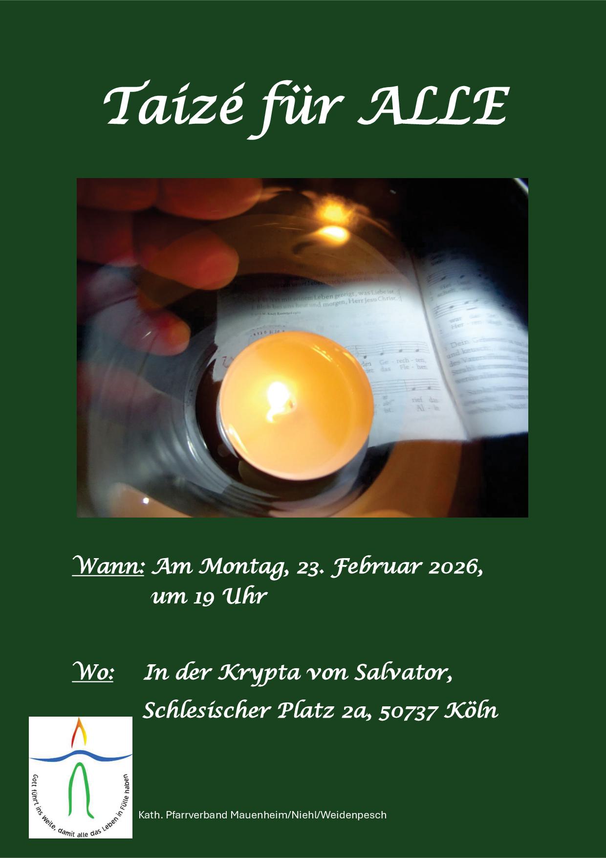 Montag, 23.02.2026, 19:00 Uhr: Taize für ALLE in der Salvator-Kirche, Schlesischer Platz, Köln-Weidenpesch |